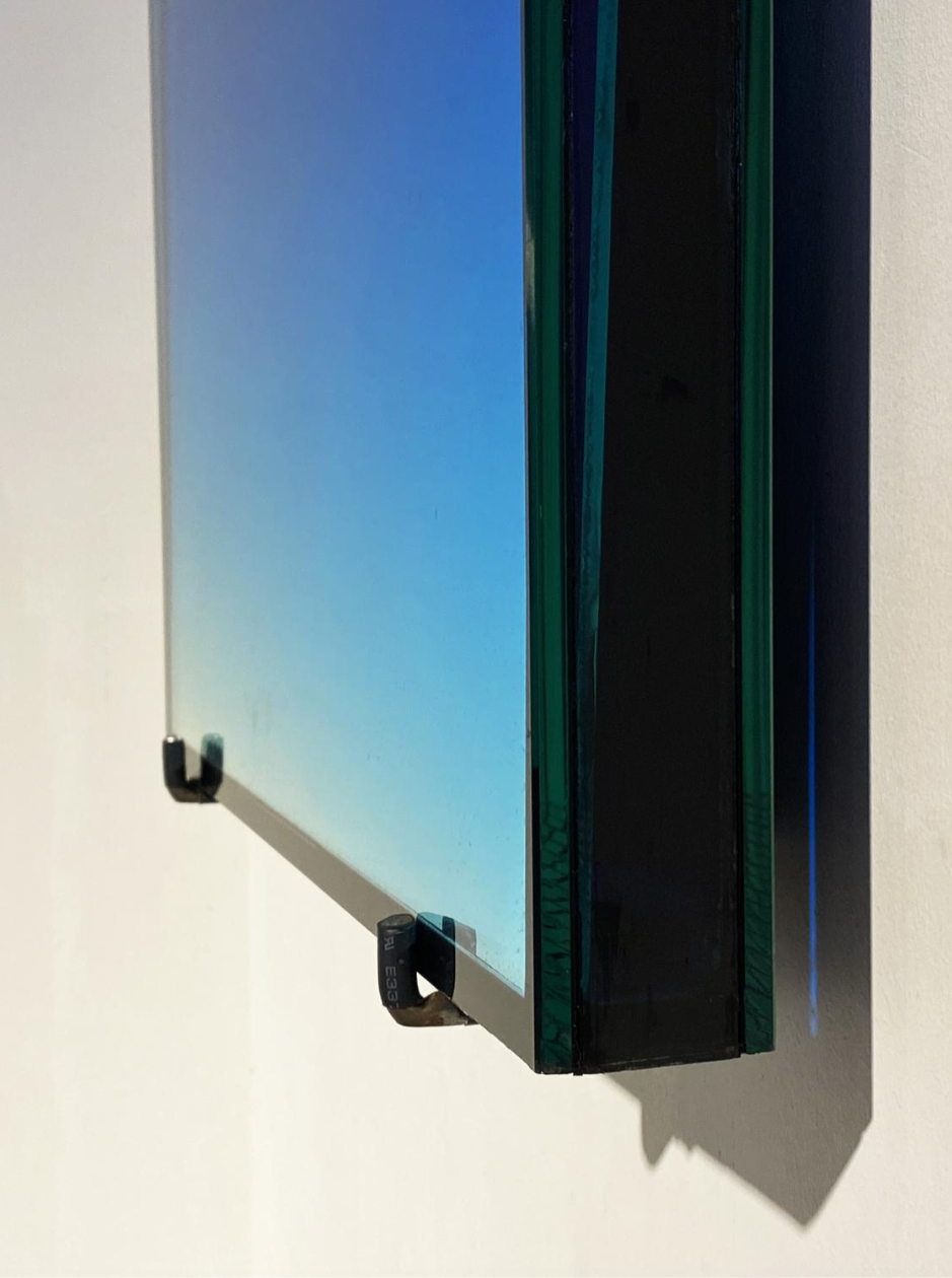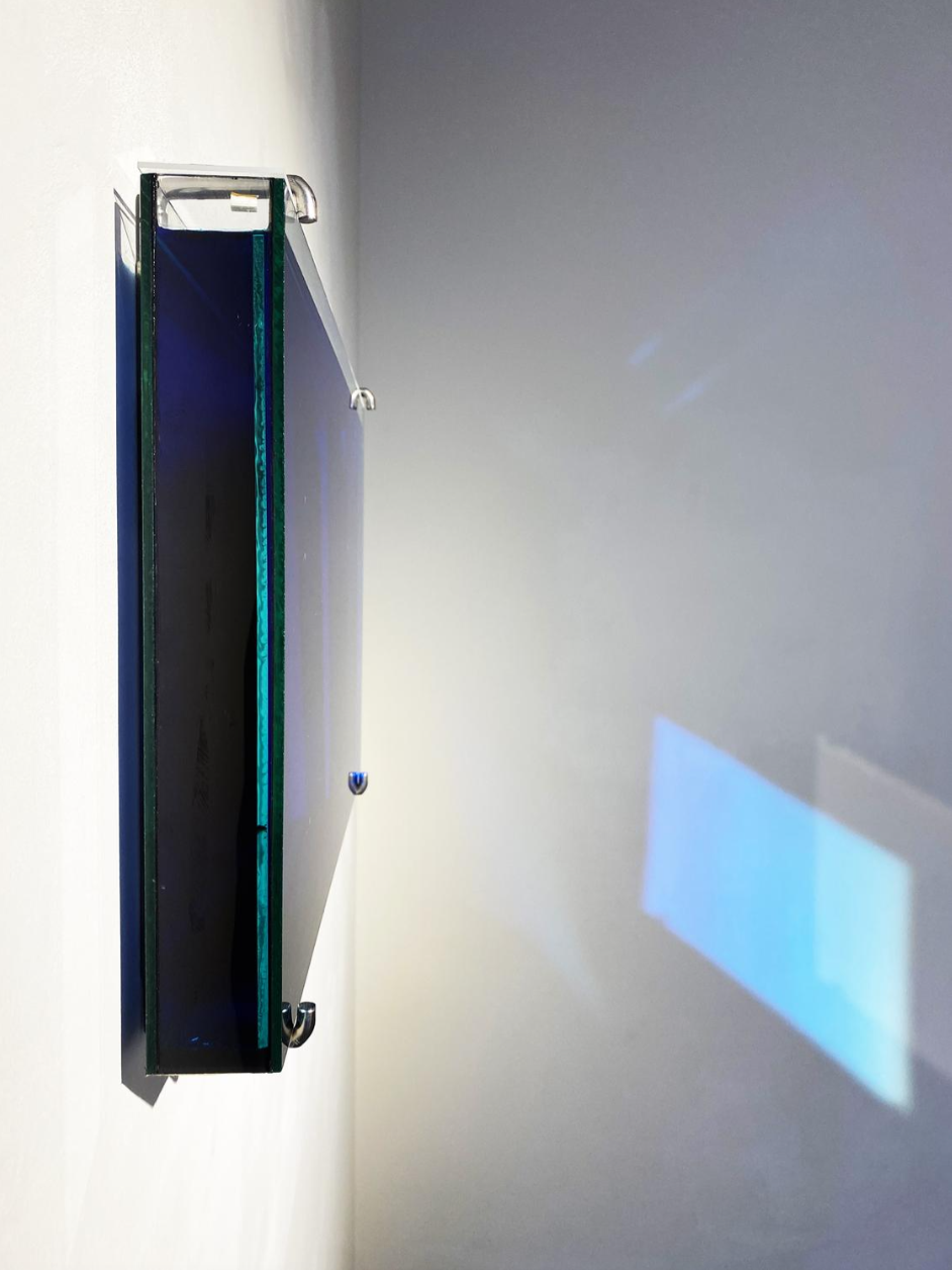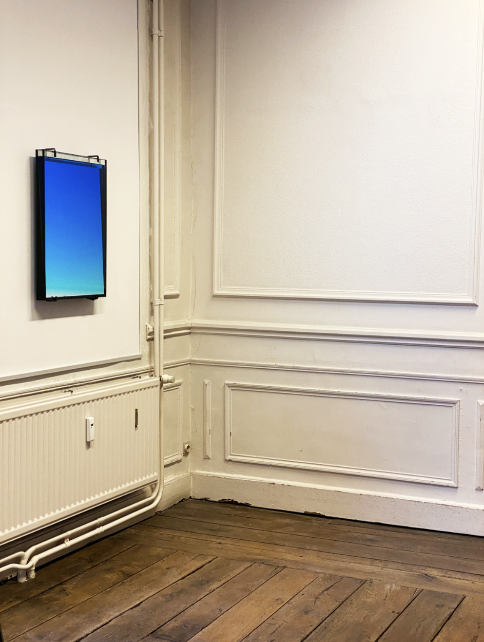 Een spiegel is onder een hoek geplaatst in een bassin dat gevuld is met water, getint met een blauw pigment. Doordat er zich aan de bovenkant van de spiegel meer water en pigment bevinden dan aan de onderkant, ontstaat een vloeiende kleurovergang. Wanneer het werk een witte muur weerspiegelt, roept het de sfeer op van het blauwe uur — het moment net nadat de zon onder de horizon is verdwenen. Het wekt de illusie van een opening in de muur, die leidt naar iets vluchtigs en onbereikbaars. Het werk geeft optisch de indruk van een elektrisch verlicht scherm of een televisie, maar in werkelijkheid is het een eenvoudige, analoge samenstelling van water, pigment en glas.